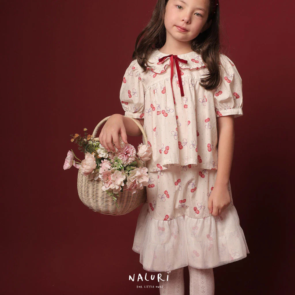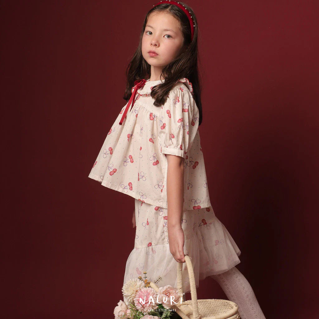 This cherry-printed skirt with lace detail looks absolutely adorable on your little one. It pairs beautifully with the Lilium Top and Lisa Knit. Designed especially for the Holiday Collection by Naluri For Little Ones, this charming cherry pattern adds a festive touch while ensuring comfort for parties and celebrations.