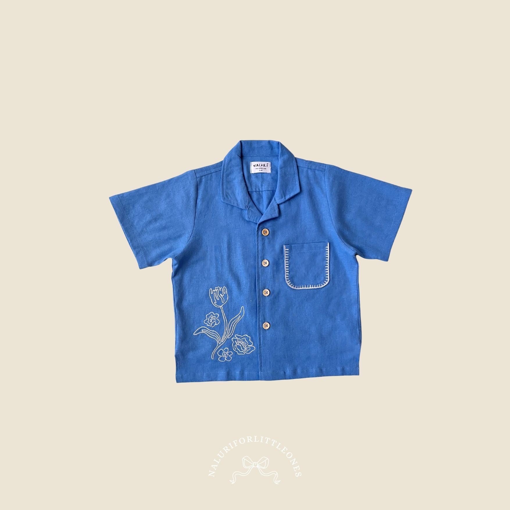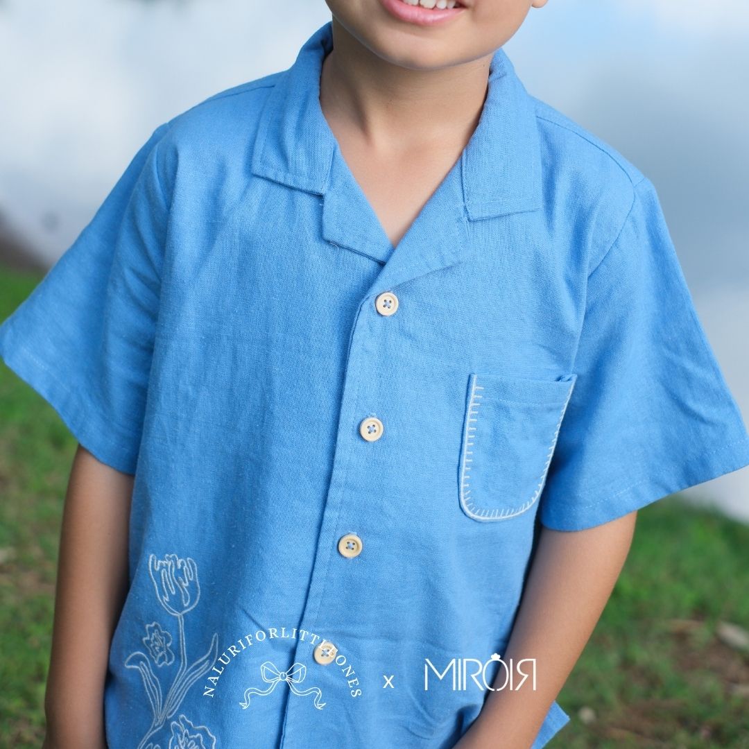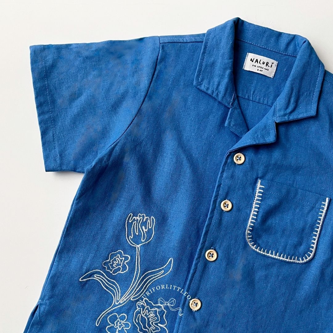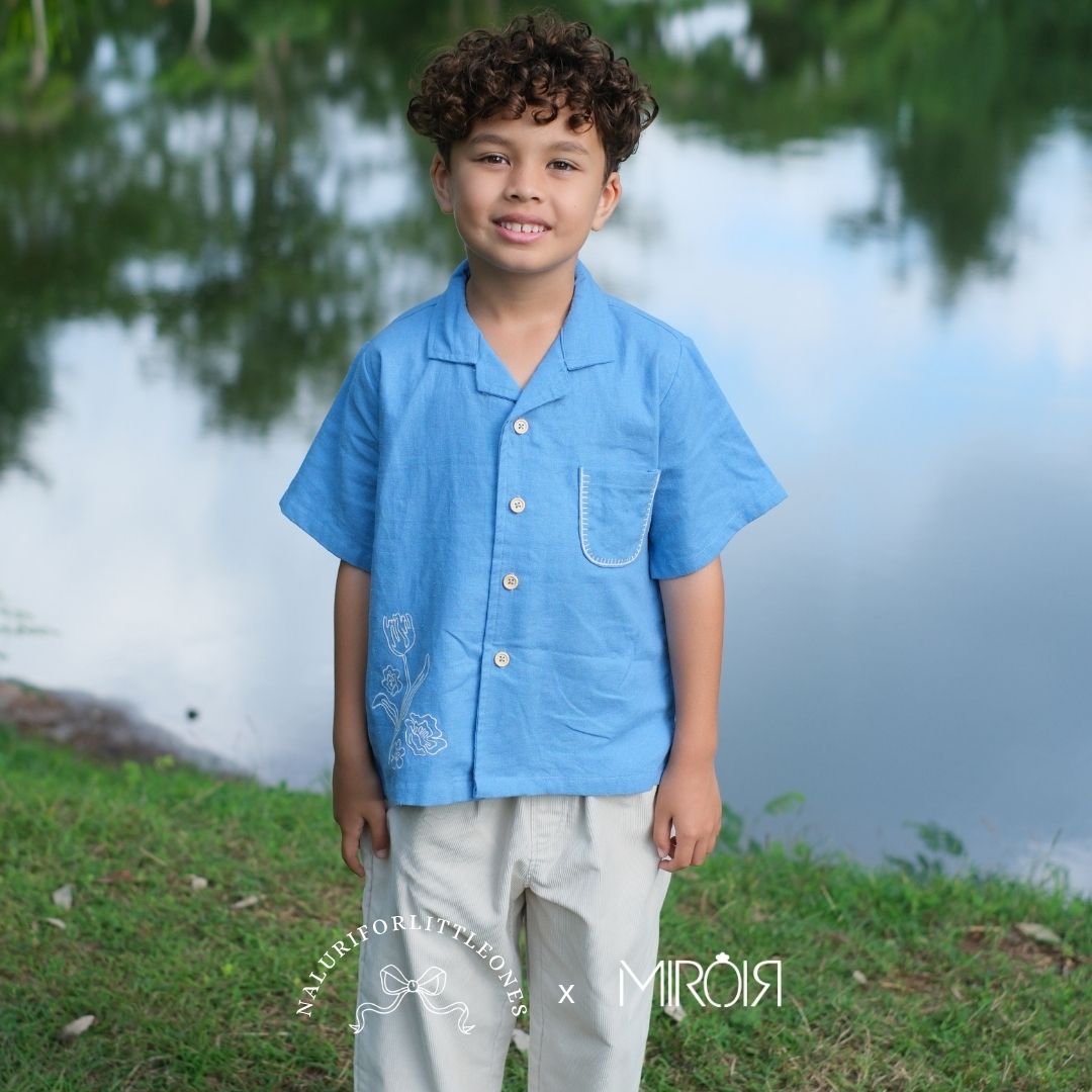 A dusty blue shirt featuring floral embroidery and a small pocket with embroidered accents, designed to be soft and comfortable for your little one. This top pairs perfectly with corduroy pants from Naluri. The embroidery motif is exclusively designed by Naluriforlittleones.