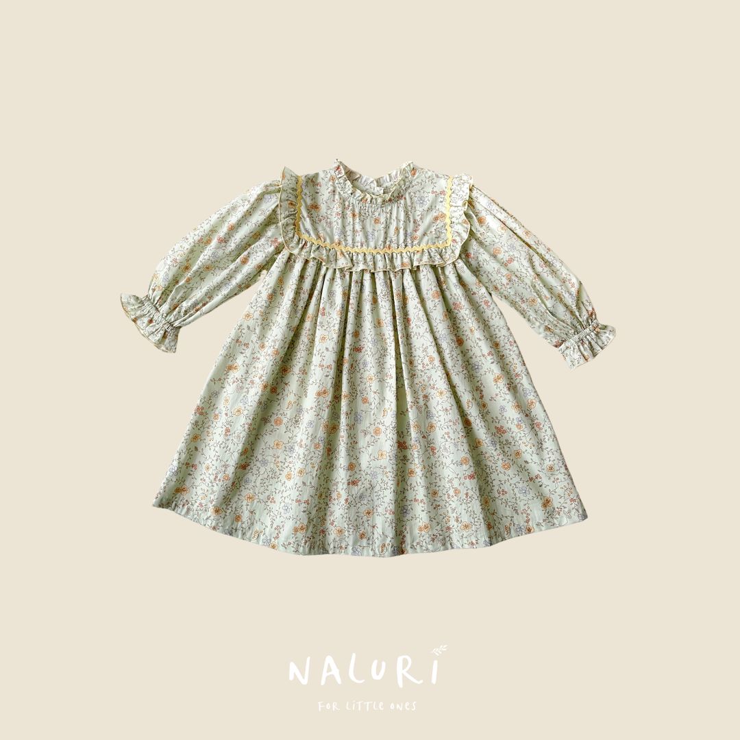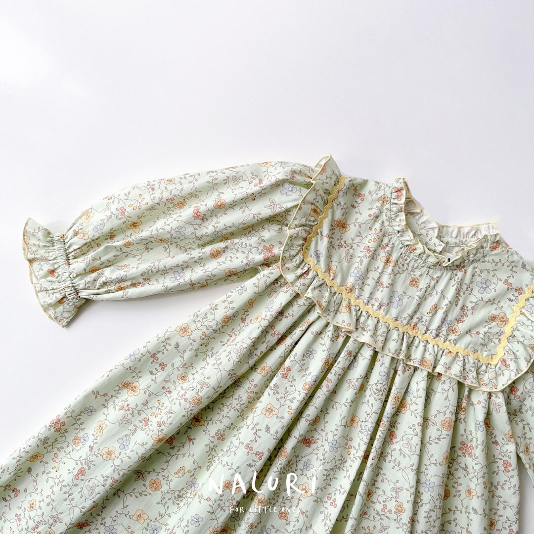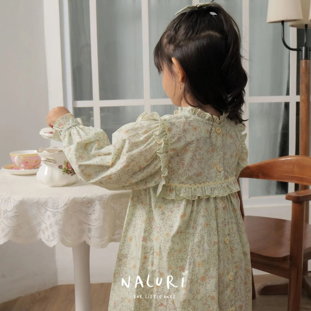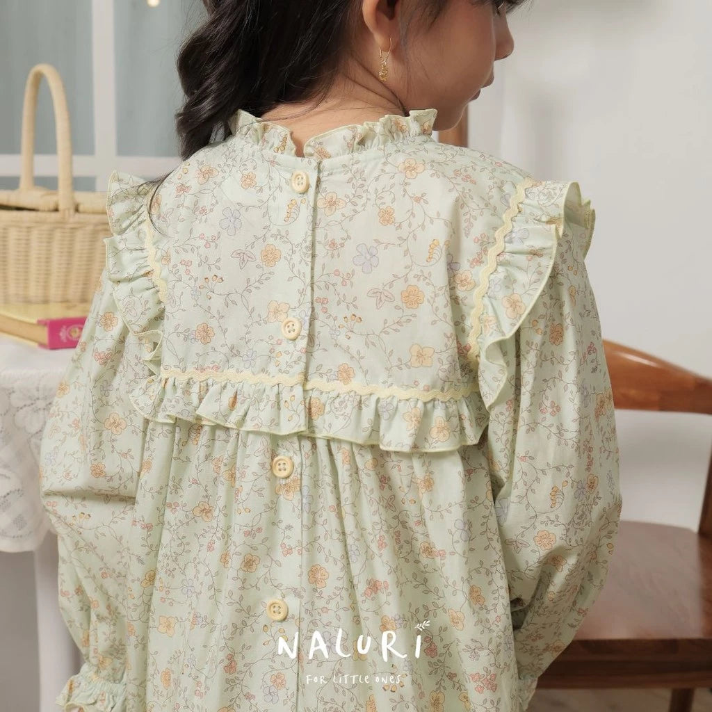 A long-sleeved floral dress featuring pleated and ruffle details on the chest — beautifully made for your little one. The charming pattern is specially designed for the "Raya Collection" by Nalurifolittleones.
