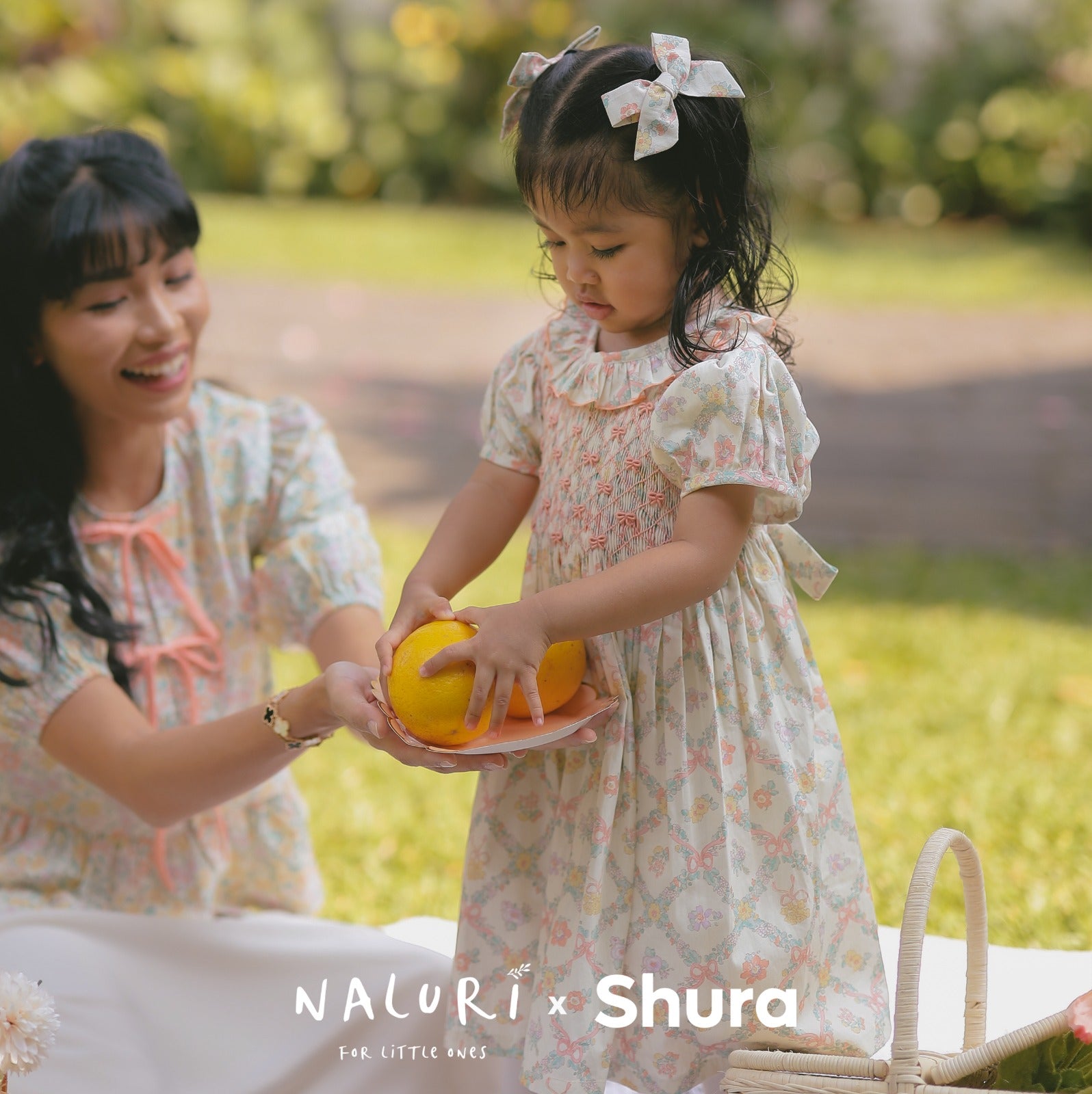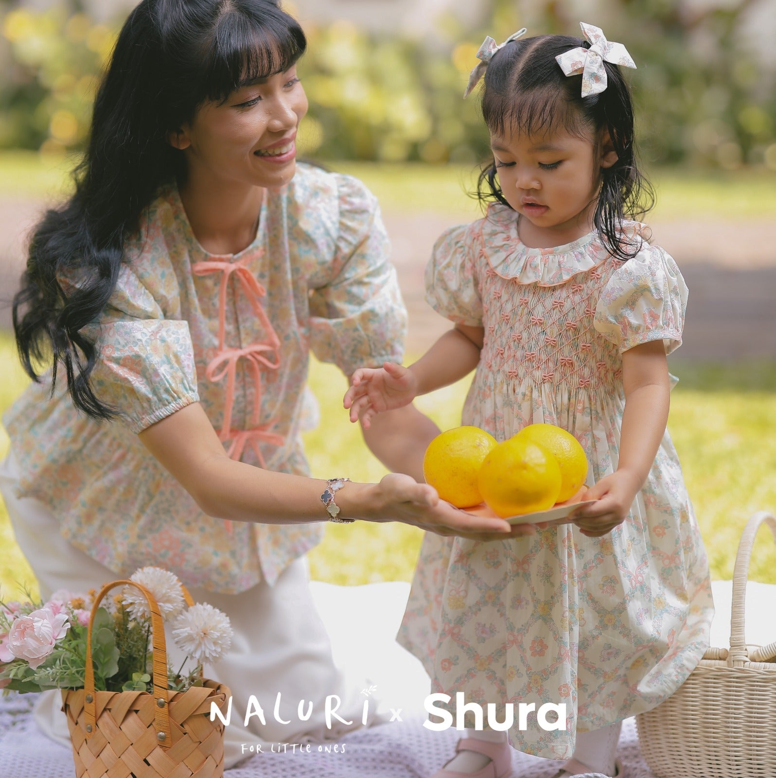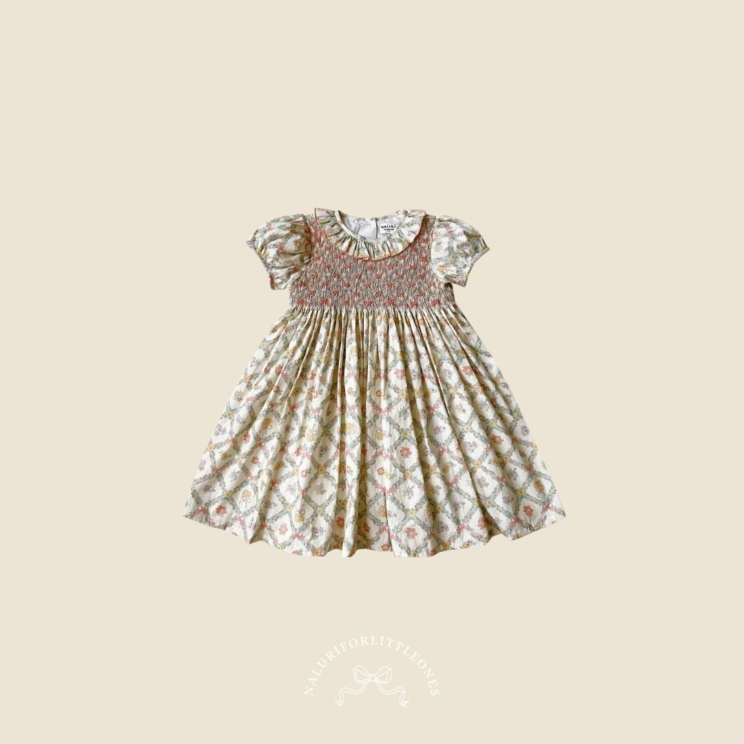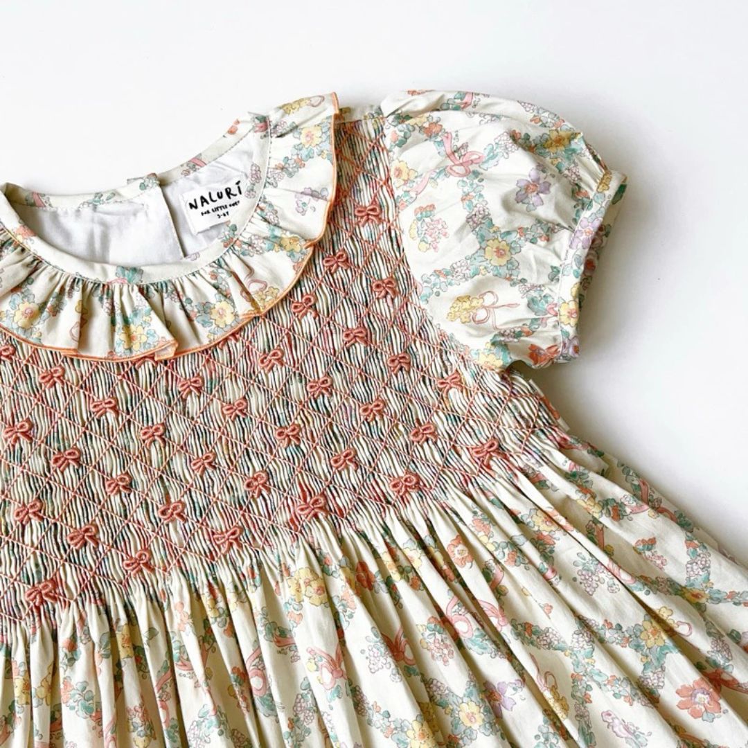 A lovely girls' dress featuring hand-smocked ribbon embroidery on the chest, making it a beautiful choice for your little one. Perfect for both everyday wear and special occasions. The charming floral pattern is specially designed for the "Shura x Naluri" collection by Naluriforlittleones.