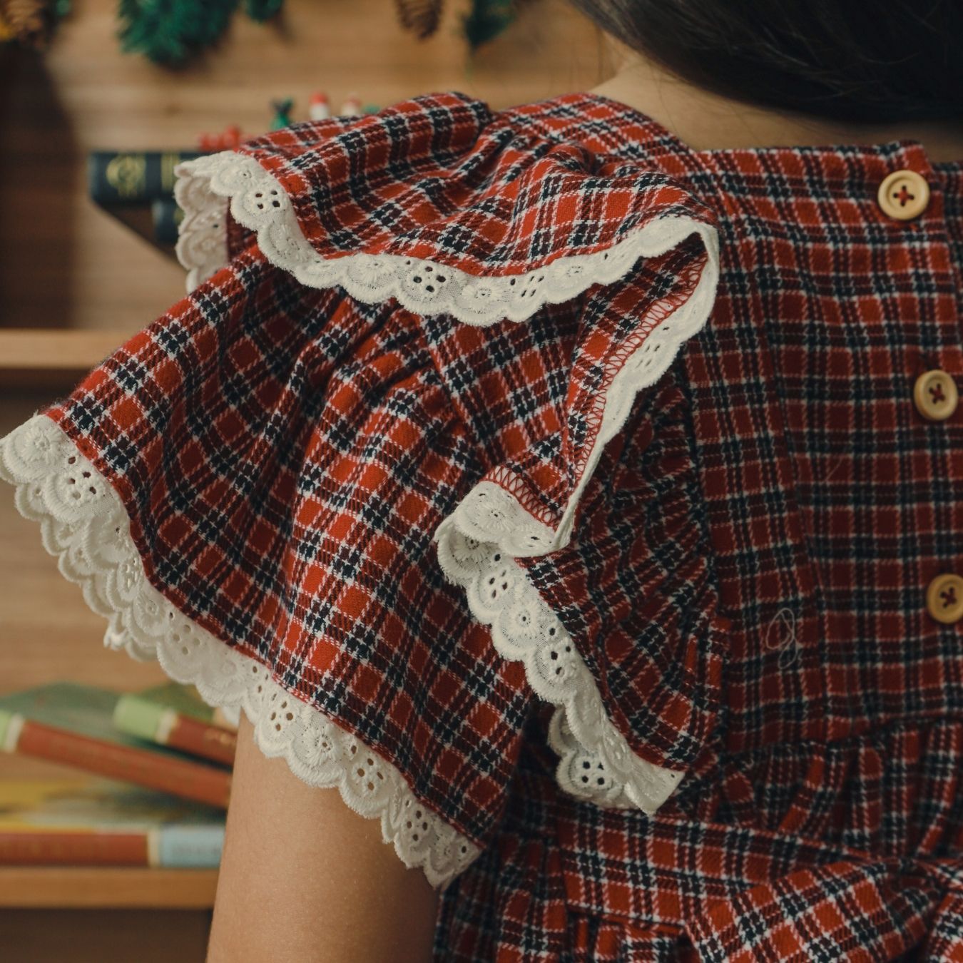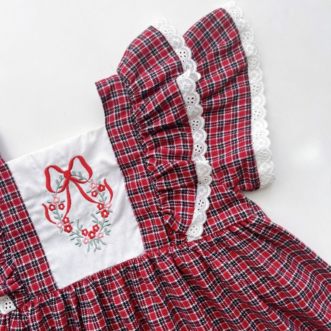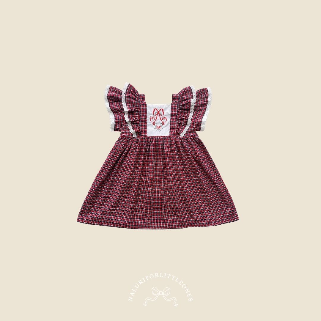 A sweet and elegant girls’ dress featuring a charming tartan pattern. It is adorned with embroidered ribbon and floral details on the chest, adding a timeless feminine touch. The beautiful pattern is specially designed for the “Holiday Magic” collection by Naluriforlittleones.