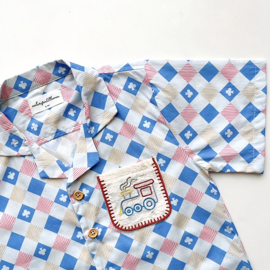 A boys’ shirt with a charming checkered diamond pattern, featuring a front pocket with embroidered details. Perfect for everydaywear and special occasions. The cute pattern is specially designed for the “Holiday Magic” collection by Naluriforlittleones.