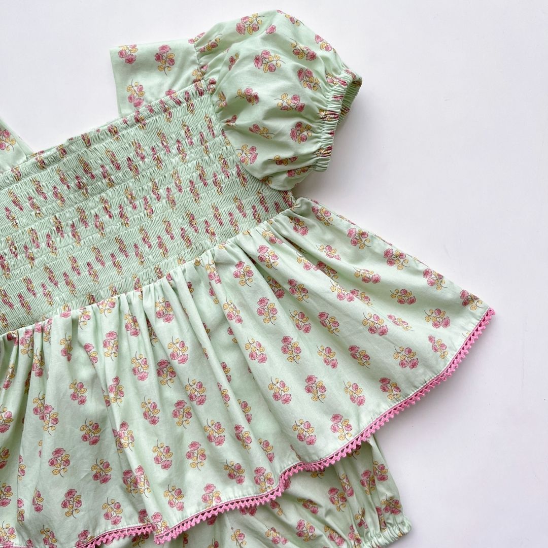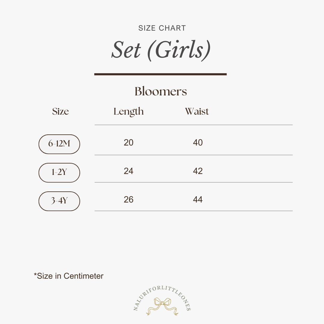 A girls’ set featuring smock detailing on the chest and delicate cotton lace accents, beautifully worn by your little one. The adorable bloomer pants are very comfortable for all-day wear. The lovely floral motif is specially designed for the matching mother-and-child collection by Naluriforlittleones.