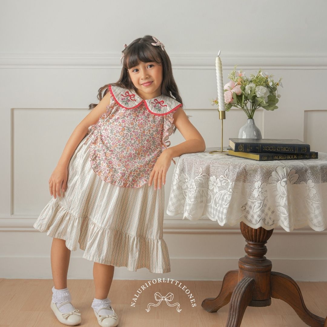 An adorable girls’ dress featuring a floral apron accent and delicate embroidery details on the collar, adding extra charm to your little one’s look. Perfect for special occasions, this dress showcases a beautiful florals and zigzag motif exclusively designed for the “Blossom Tales” collection by Naluriforlittleones.