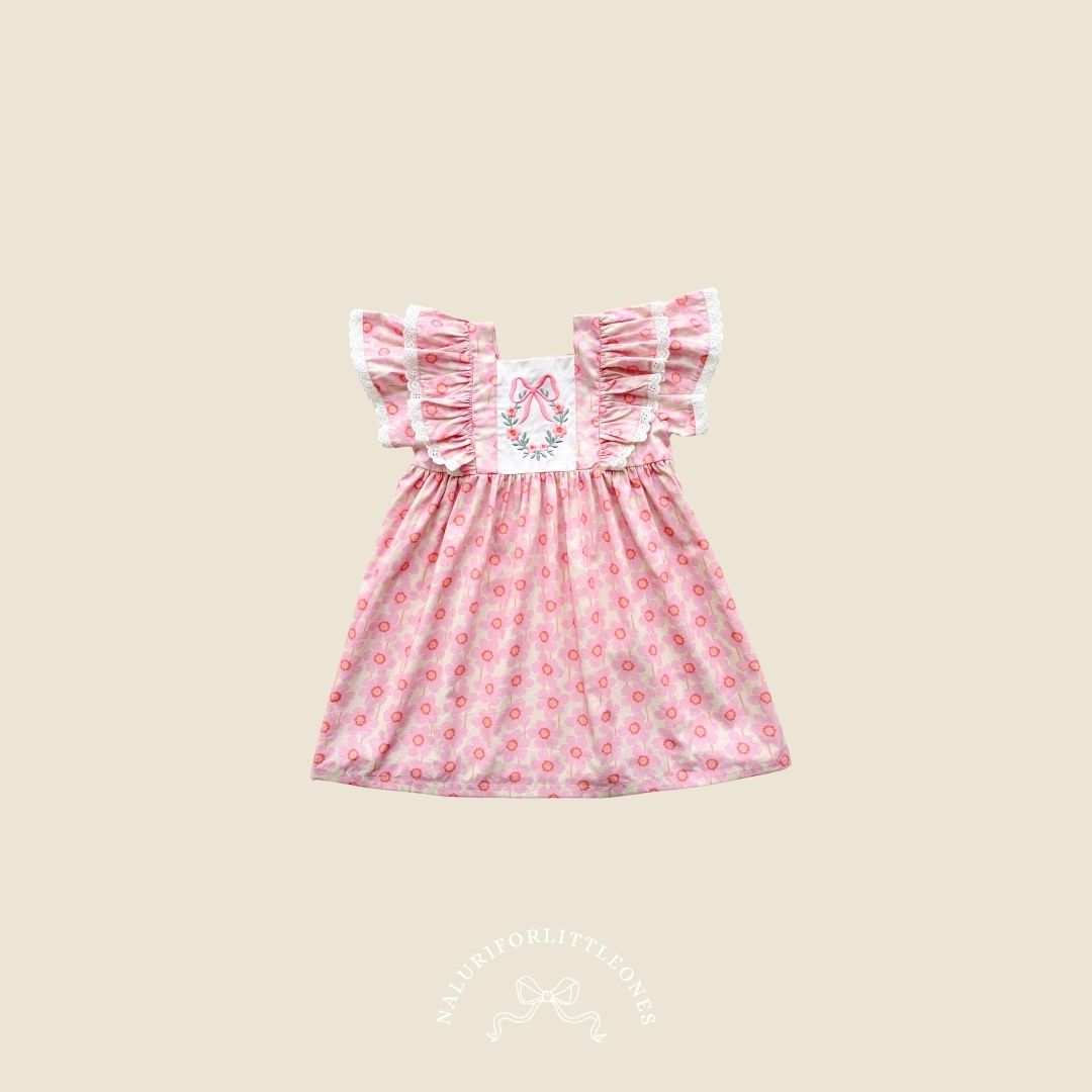 A girls’ dress featuring a floral motif and an embroidered bow detail on the chest, complemented by ruffles and white lace accents. This beautiful dress looks adorable on your little one. The lovely floral pattern is specially designed for the “Blossom Tales” collection by Naluriforlittleones.