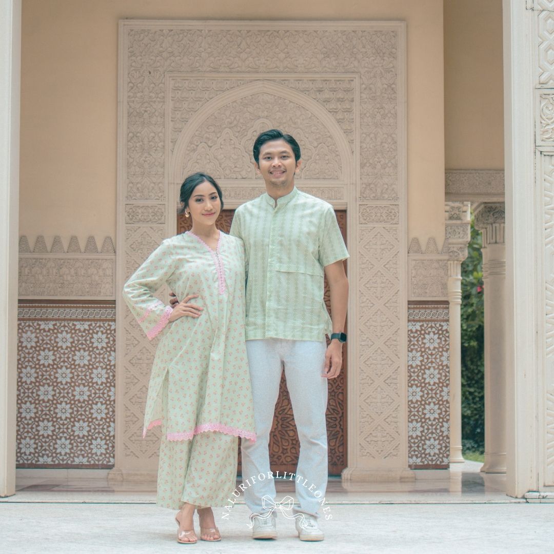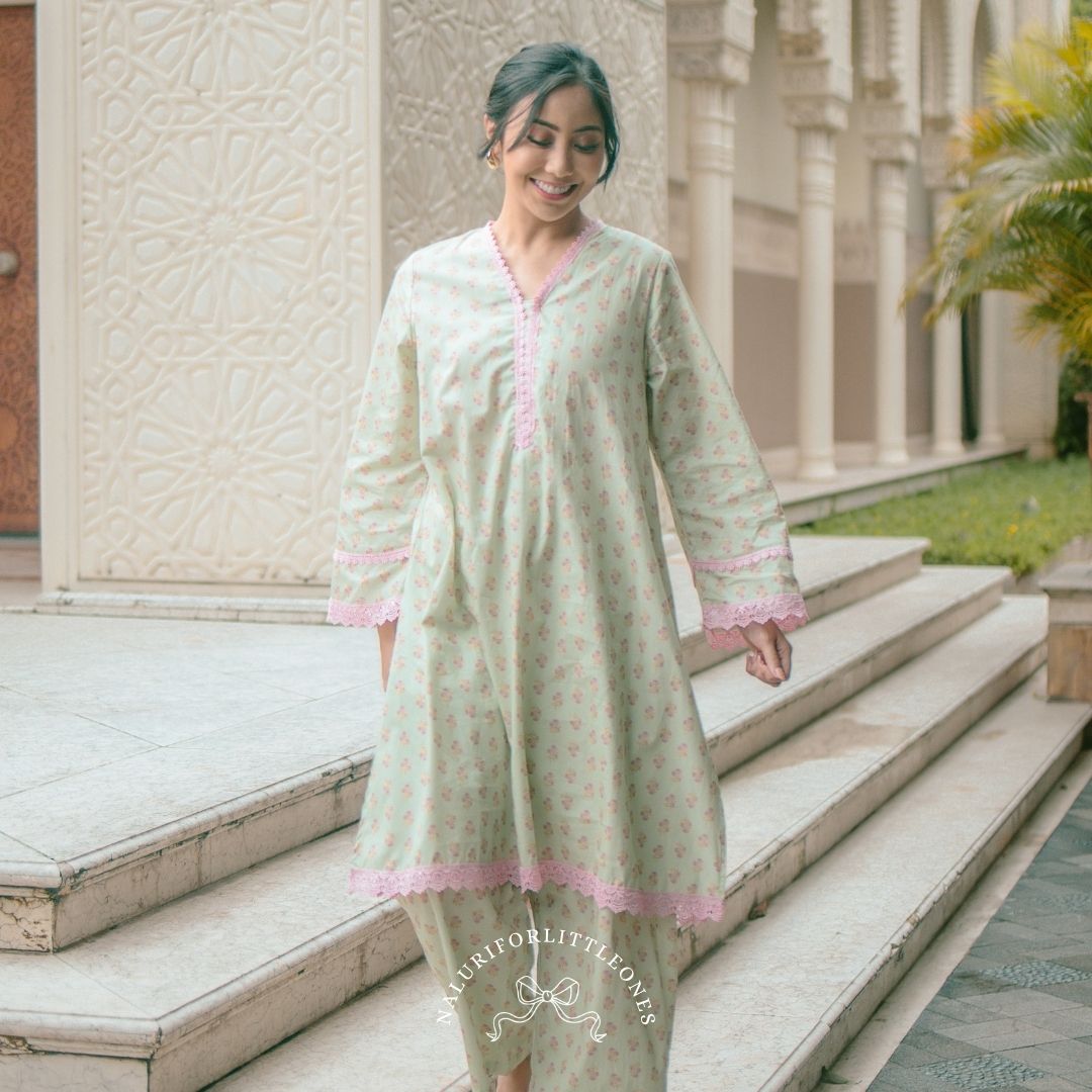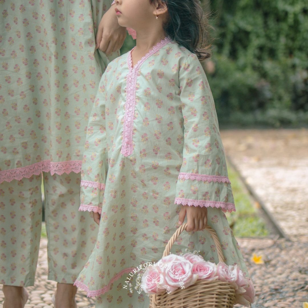 A matching mother-and-child blouse featuring a sweet small floral pattern, enhanced with delicate lace details on the neckline, sleeves, and hem. Perfect for everyday wear as well as special moments such as Eid. This exclusive floral motif is specially designed for the matching mother-and-child collection by Naluri For Little Ones.