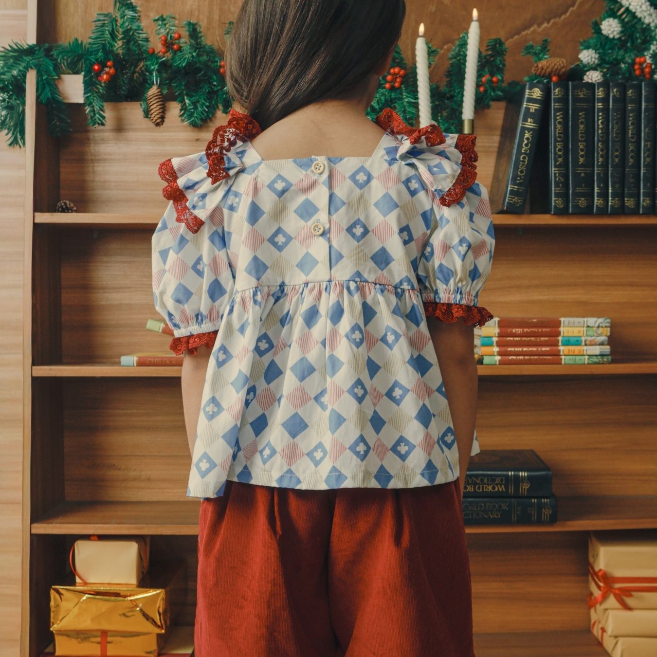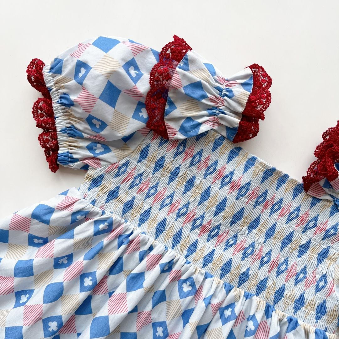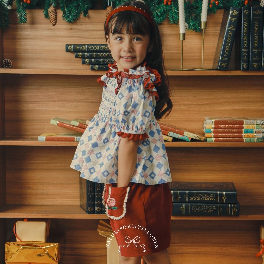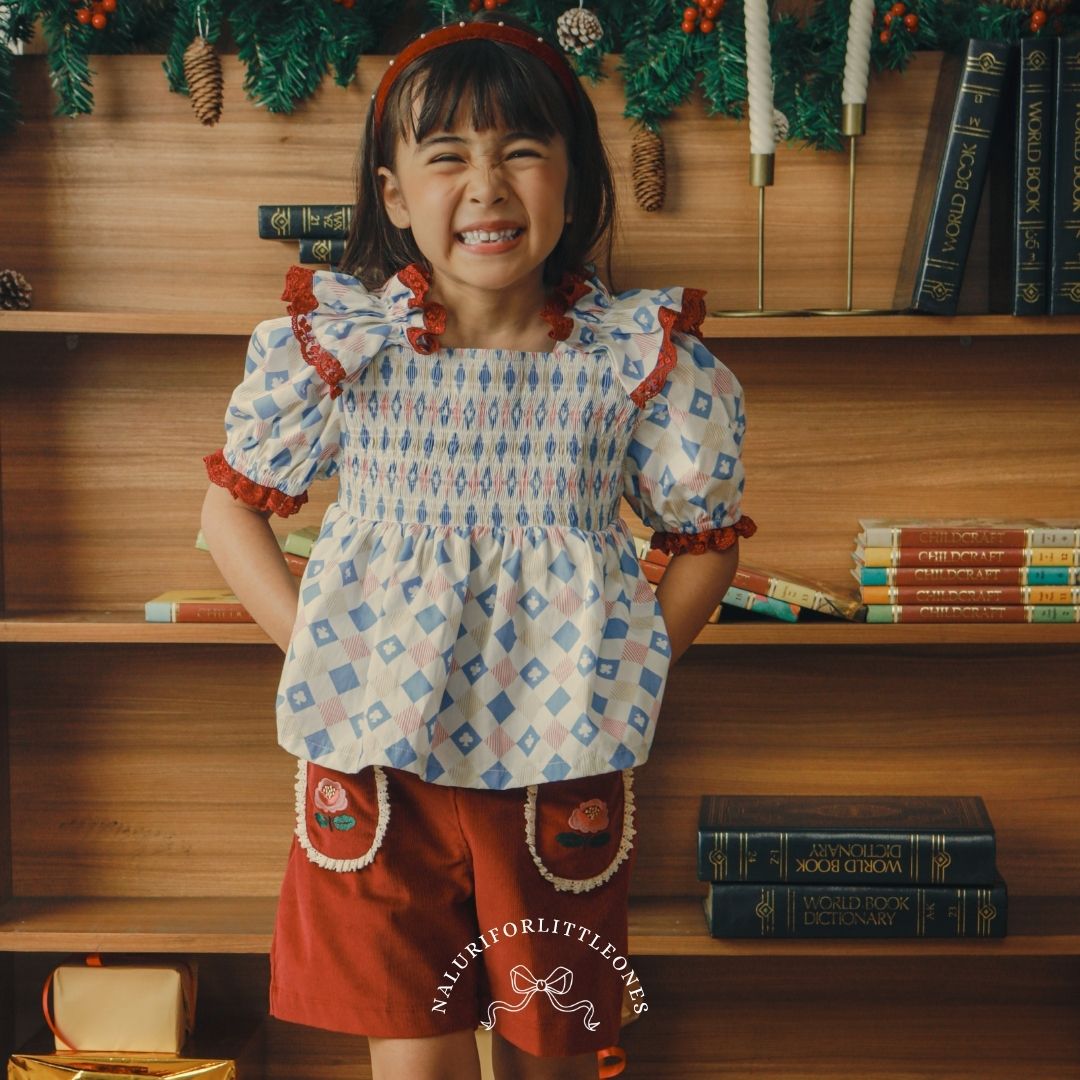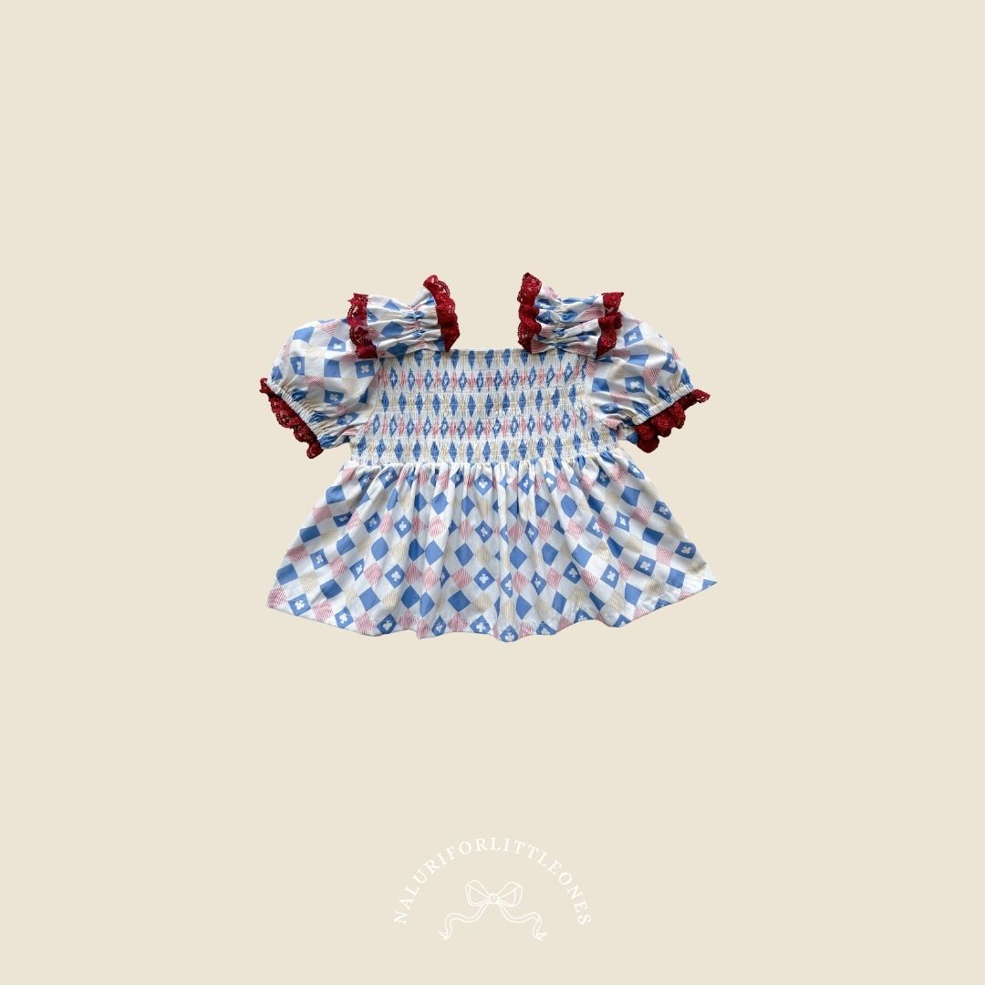 A sweet girls’ top featuring a charming checkered diamond pattern, adorned with elastic smocking on the chest and maroon lace details that make your little one look even more adorable. This pattern is specially designed for the “Holiday Magic” collection by Naluriforlittleones.