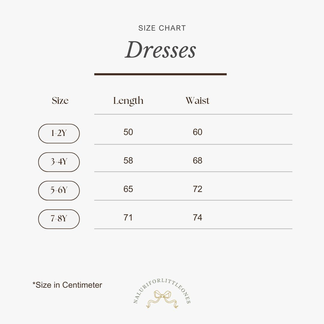 Size 3-4 years = Dress Length 58 cm, Chest 68 cm