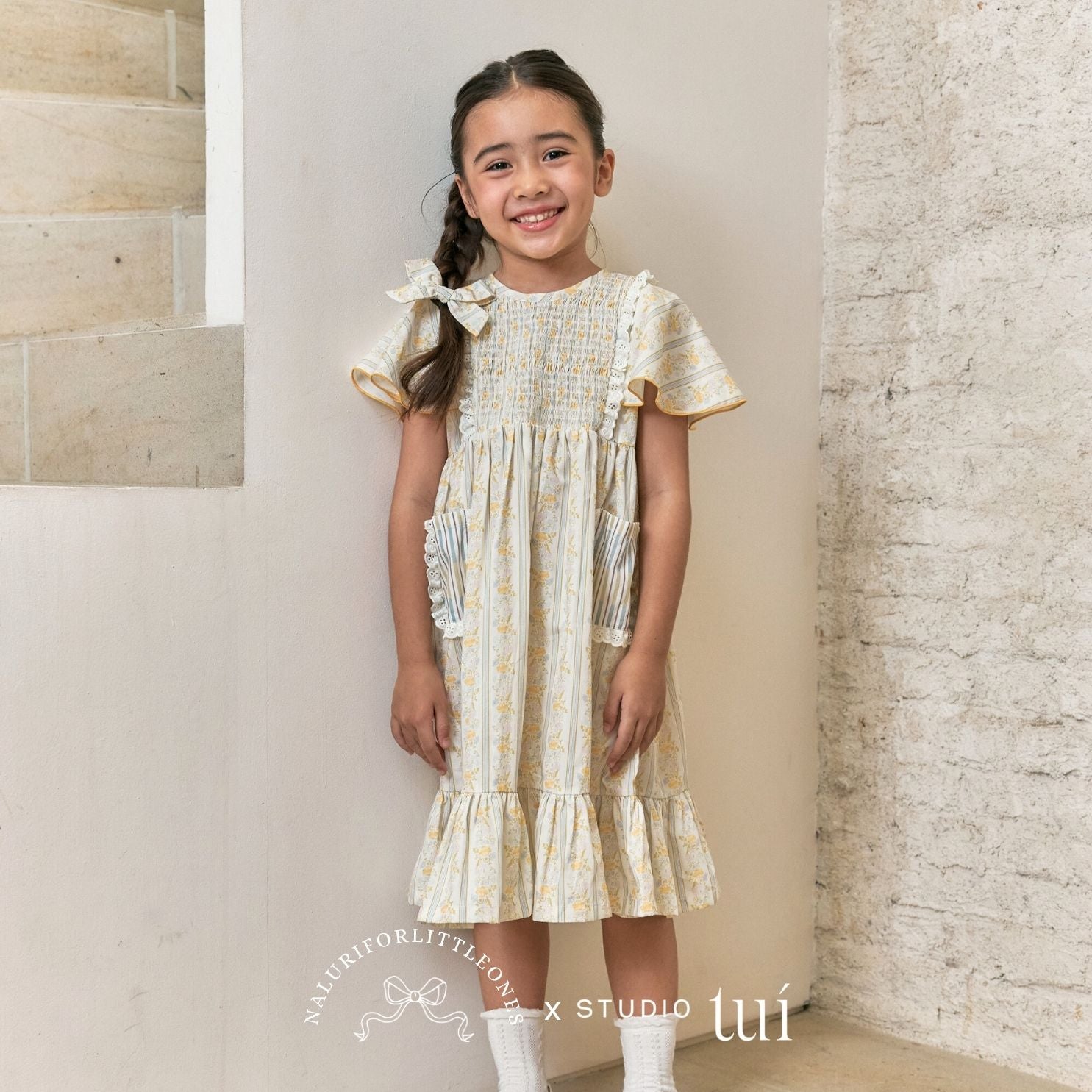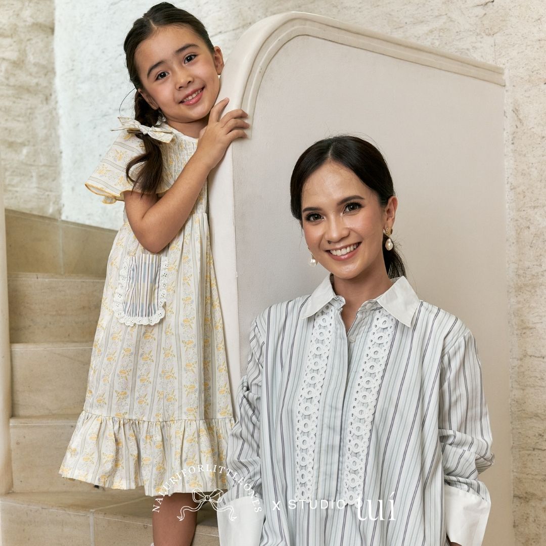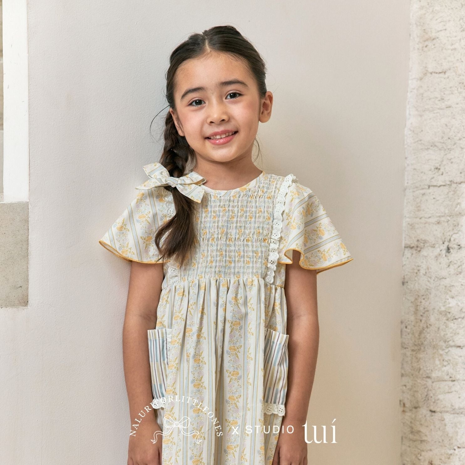 Girls’ dress with smocked detailing, flutter short sleeves adorned with lace, and striped pockets — a beautifully designed piece, specially created for the mother-and-child twinning collection by “Naluriforlittleones x Studio Tui.”