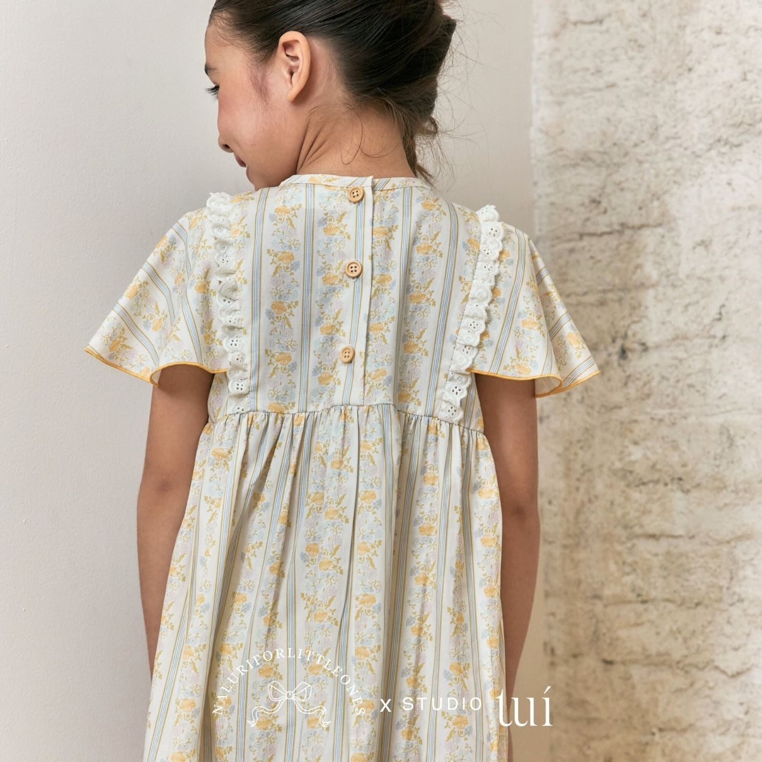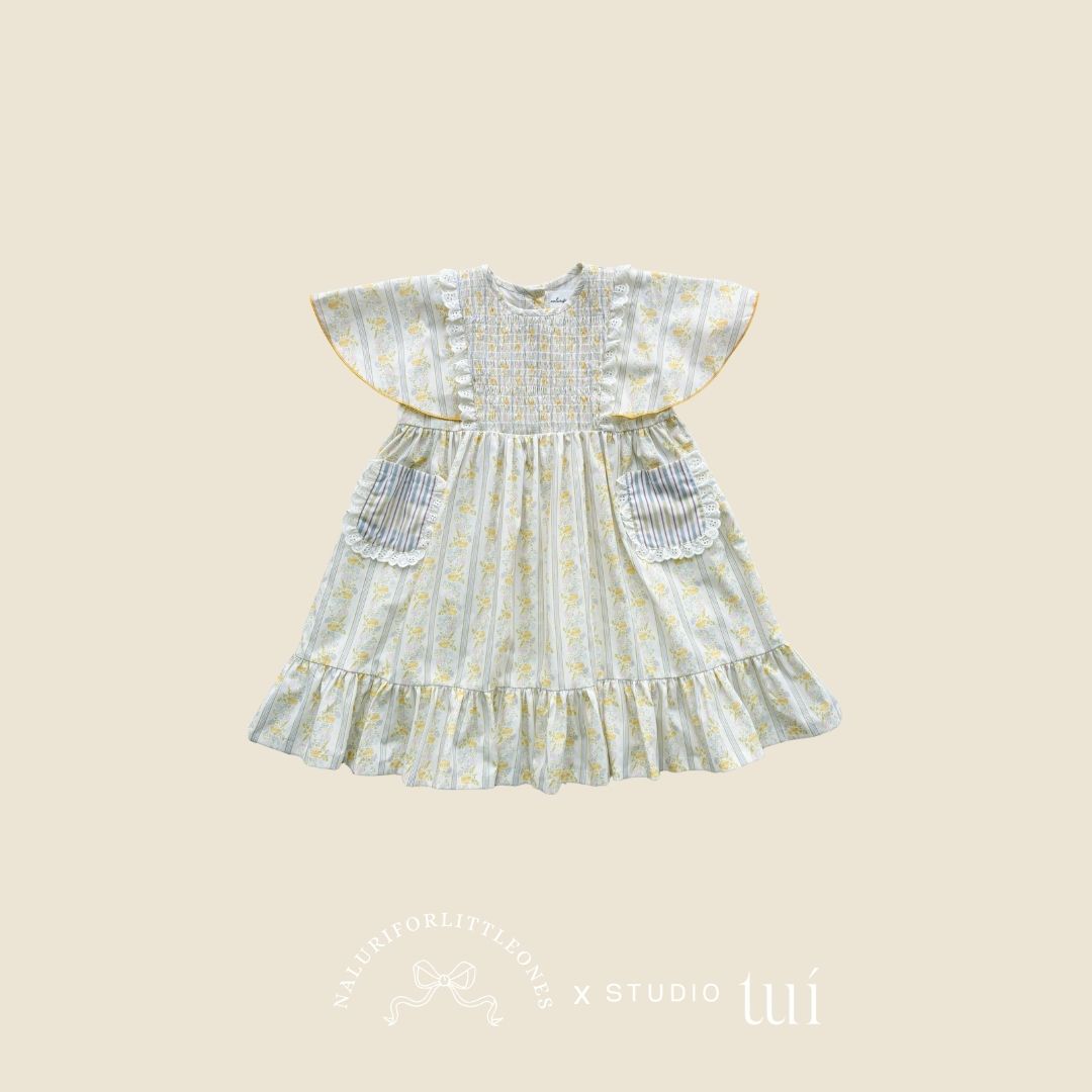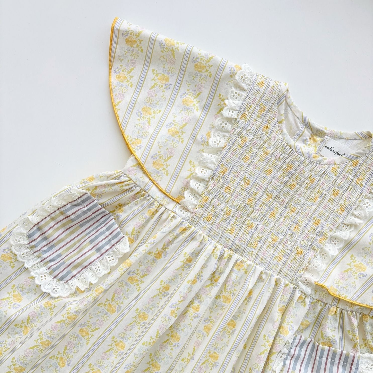 Girls’ dress with smocked detailing, flutter short sleeves adorned with lace, and striped pockets — a beautifully designed piece, specially created for the mother-and-child twinning collection by “Naluriforlittleones x Studio Tui.”