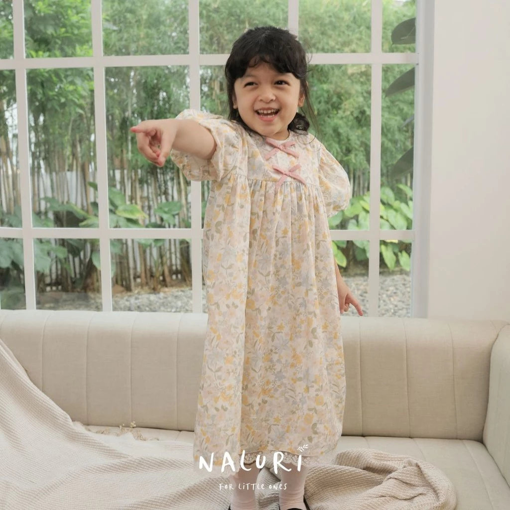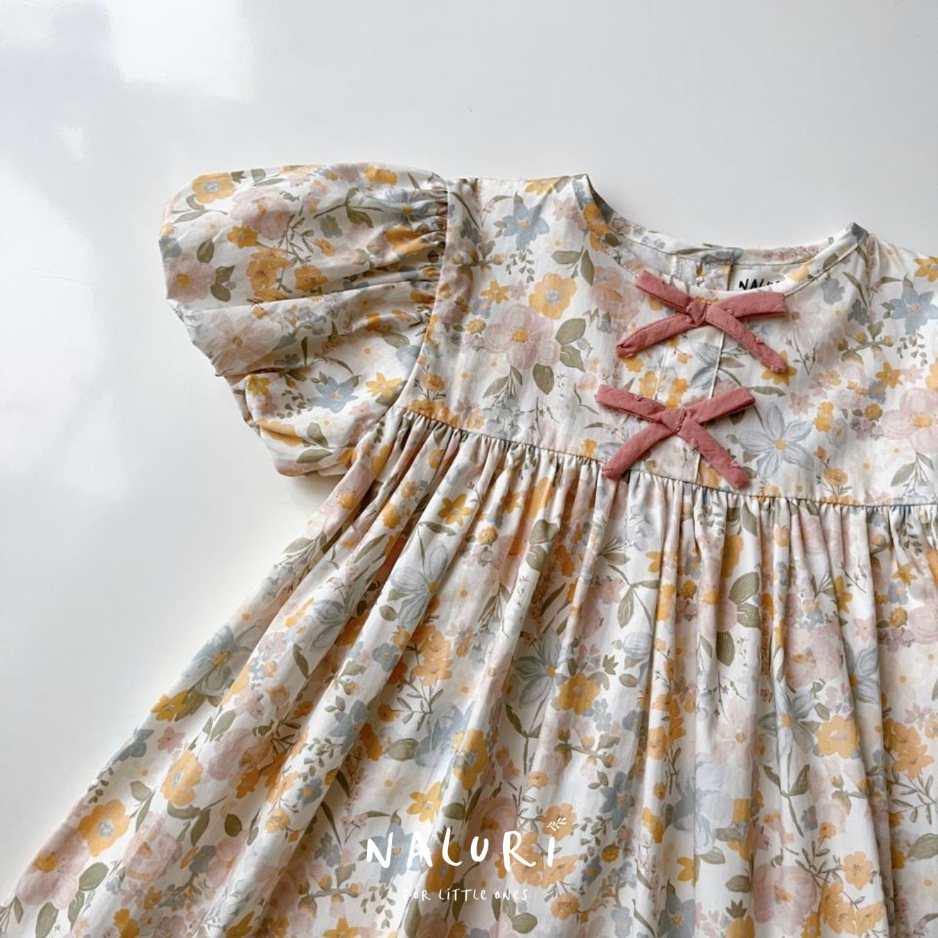 A beautiful girls' dress with a bow detail on the chest, perfect for your little one. The charming floral pattern is specially designed for the "Raya Collection" by Naluriforlittleones.